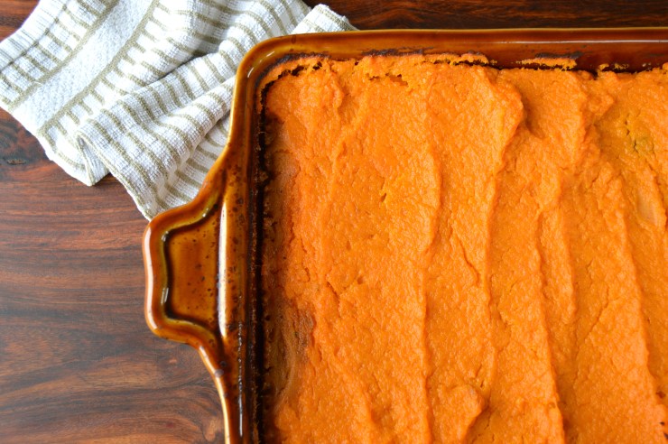 In a 9″ x 13″ baking dish, add meat mixture to bottom and spread sweet potato mixture on top.